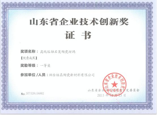 山東省企業技術創新獎-優秀成果一等獎(高純熔融石英陶瓷坩埚)-Honor and qualification-煙台厦门浩发传感器制造集团